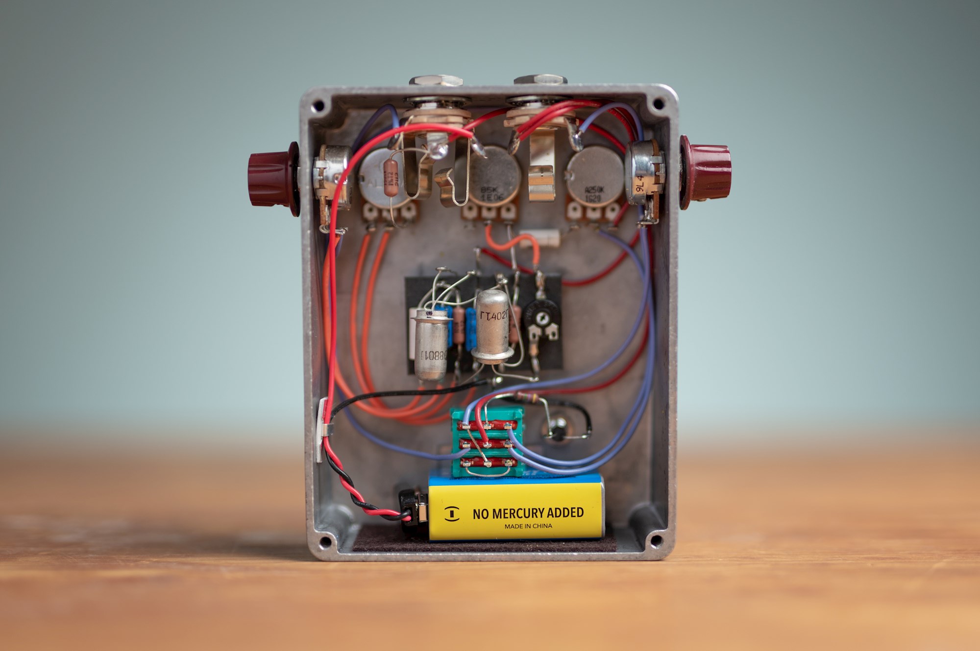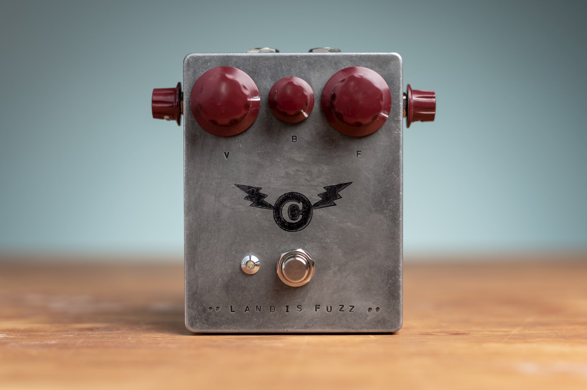 The big one sets the volume, and since we had the room (and because our other pedals have knobs on their sides) we added two more. One to dial in the amount of low-end (Range) and another for setting the overall gain (Saturation).