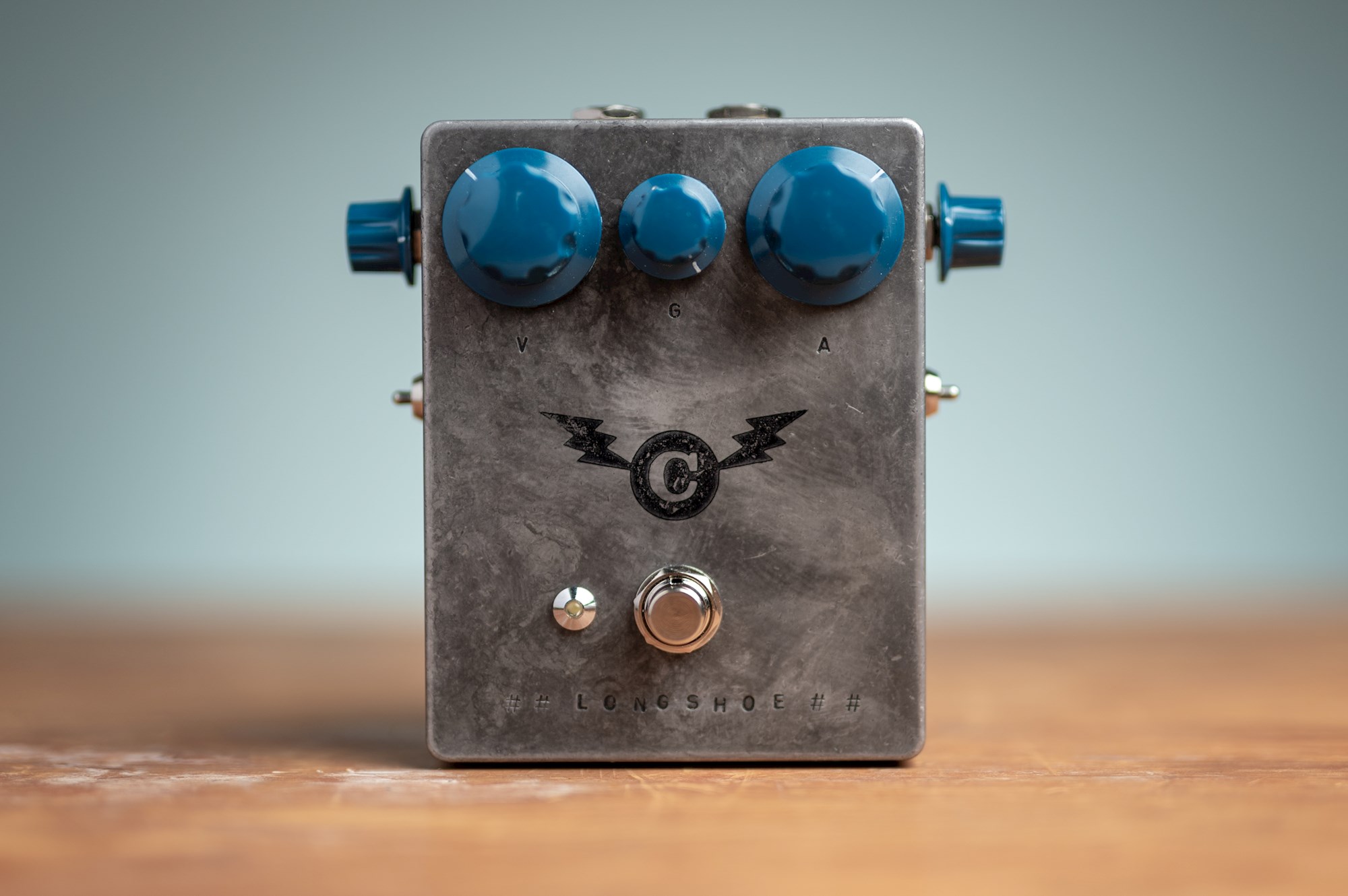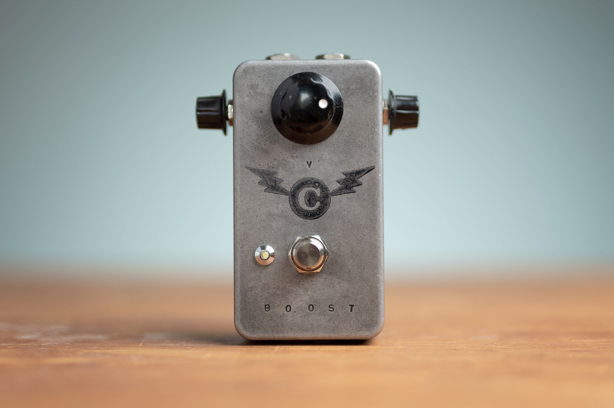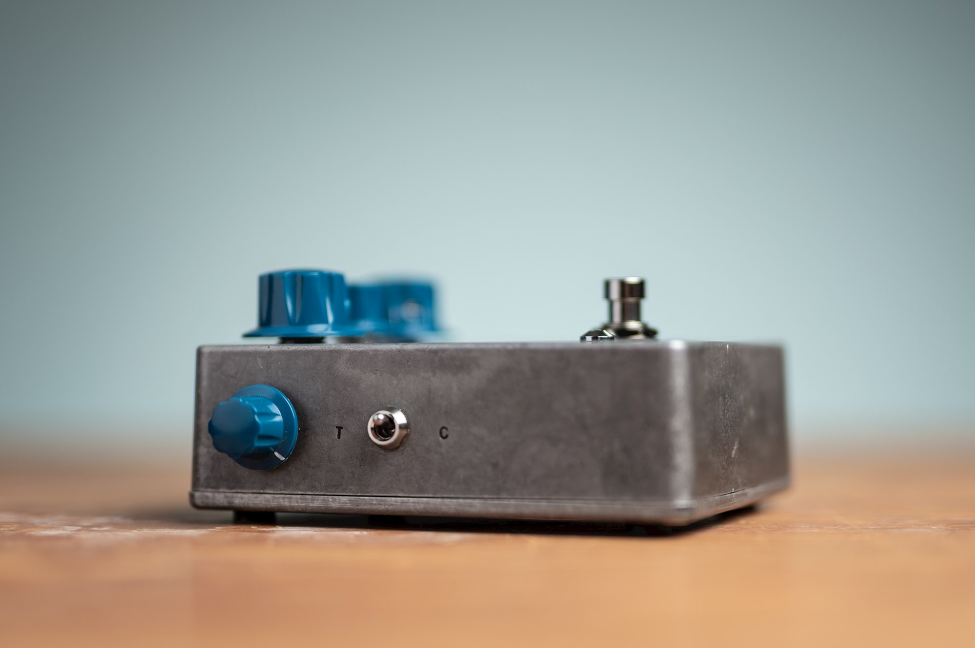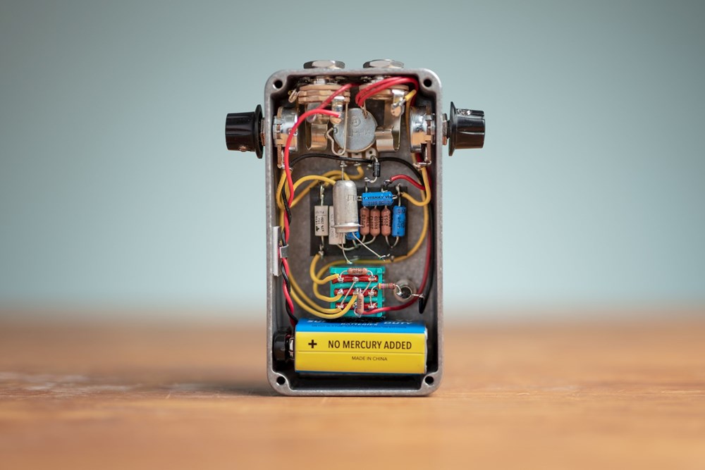 The big one sets the volume, and since we had the room (and because our other pedals have knobs on their sides) we added two more. One to dial in the amount of low-end (Range) and another for setting the overall gain (Saturation).